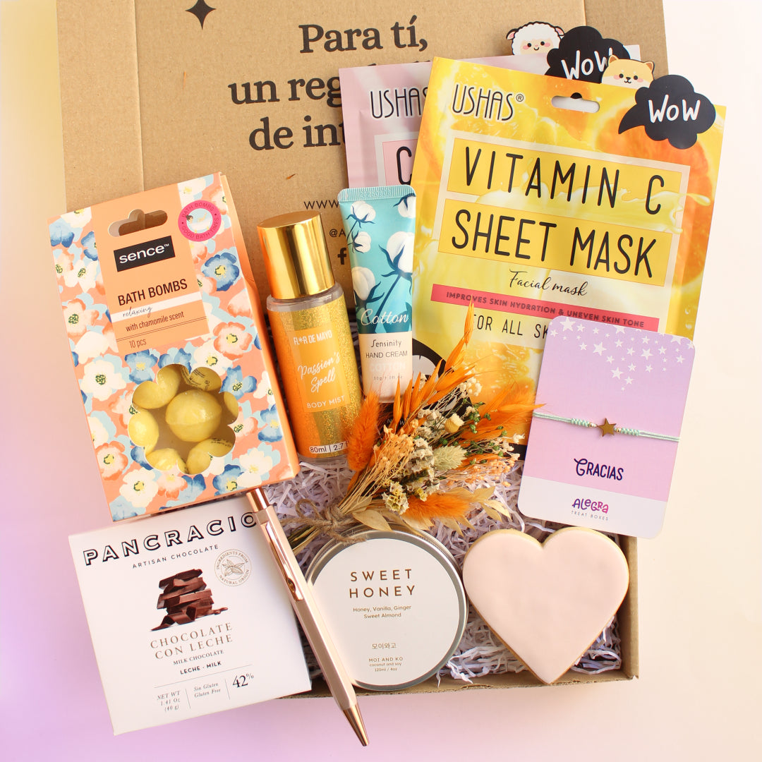 Cada caja se envía empaquetada con mucho cariño y cuidado. Se usa caja de cartón kraft, papel de seda, viruta de papel y lazo satinado para asegurar que no sólo llega a su destinataria en las mejores condiciones, sino que cause la mejor impresión cuando la abra.